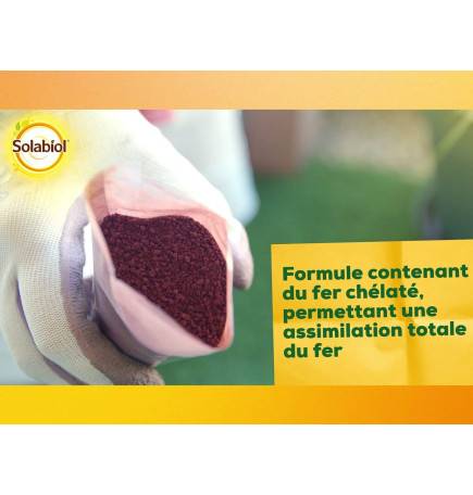 Solabiol Sequestrene Antichlorose ist ein Düngemittel NF U 42-001 (NPK 3-2-5), das aus Inhaltsstoffen natürlichen Ursprungs gemäß der Verordnung (EG) Nr. 834/2007 hergestellt wird. Es enthält unter anderem Rübenvinasse und Fischextrakte, die dazu beitragen, den Boden anzureichern und seine Fruchtbarkeit im Laufe der Zeit zu erhalten. Stickstoff (N), Phosphor (P) und Kalium (K) unterstützen das Wachstum und die Blüte, während Spurenelemente, einschließlich Eisen, dazu beitragen, ein kräftiges Laub und eine regelmäßige Blüte zu erhalten.