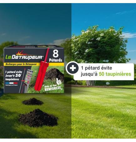Moles and mole rats turn your lawn into a battlefield? Don't panic, the 8x refills for the Drummer are the secret weapon to fight against these intruders. Designed for use with the Détaupeur anti-mole system, these refills provide a quick and effective solution to protect your garden. Usable even in the rain, they are ready to take on any challenge, taking out up to 50 molehills with a single firecracker.