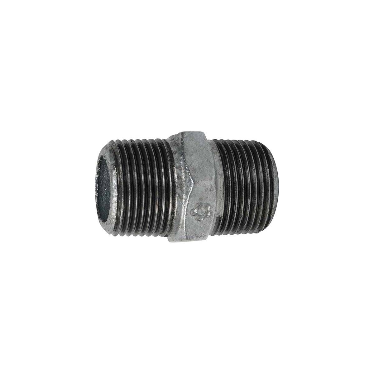 La boquilla macho-macho de hierro fundido maleable galvanizado es un accesorio de unión extremadamente duradero para la distribución de fluidos. Fabricado con EN-GJMB-350-10 y EN 10242 y certificado ISO 49, es ideal para sistemas de agua, gas, vapor y HVAC. El recubrimiento de galvanizado en caliente, con un espesor mínimo de , proporciona una resistencia superior a la corrosión, esencial para entornos húmedos o exteriores. Sus dos roscas macho cónicas (R), que cumplen con la norma ISO 7-1 (BSPT), garantizan un sello de alta calidad, verificado por una prueba unitaria Esta cabecilla es la elección de la fiabilidad profesional y también es apreciada para la creación de muebles industriales por su aspecto crudo y robustez, garantizando así un rendimiento técnico y una estética vintage.