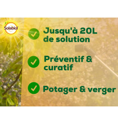 Este producto multifuncional actúa eficazmente contra el mildiú velloso, ya sea el de la vid, la papa o el tomate. Además del mildiú velloso, Porridge Bordelaise Solabiol también es eficaz contra el enrollamiento de la hoja de durazno y la sarna de la manzana, dos enfermedades que pueden causar daños significativos a su jardín si no se tratan.