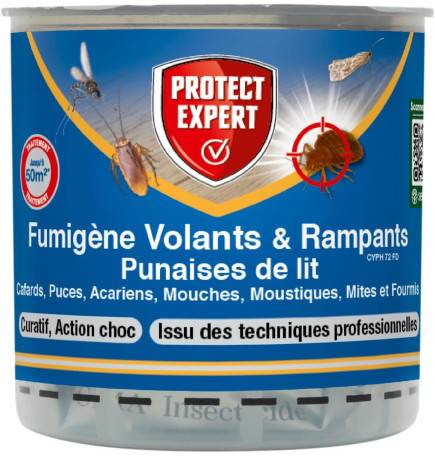 Desde los primeros segundos después de la activación, el humo emite una poderosa niebla que se extiende por toda la habitación, llegando incluso a las zonas de difícil acceso. Este producto es capaz de tratar un área de hasta 25 m² o 65 m³ para insectos rastreros y hasta 130 m³ para insectos voladores. Gracias a su fórmula específica, las chinches, sus larvas y otros parásitos como los ácaros, se neutralizan rápidamente, ofreciendo así una solución rápida y completa para una desinfestación exitosa.