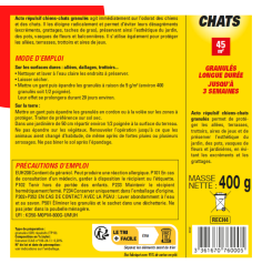 Fácil de usar, simplemente extiéndalo sobre suelo seco para una protección efectiva durante unos 20 días. Este tratamiento ayuda a cambiar los malos hábitos de los animales a largo plazo. Es perfecto para proteger superficies inertes como grava o losas, pero no debe aplicarse a las plantas.