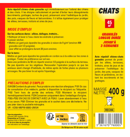 El repelente granular ACTO para perros y gatos es la respuesta a estos problemas. Su fórmula se basa en una acción olfativa que altera los hábitos de los animales sin causarles daño. El ingrediente activo es Geraniol (CAS No. 106-24-1), un compuesto con un contenido del 0,20% conocido por sus propiedades repelentes. Al crear una barrera de olores persistente, estos gránulos dejan en claro a los perros y gatos que se debe evitar el área. Es un método disuasorio que actúa directamente sobre su comportamiento alentándolos a marcar su territorio en otro lugar que no sea su país.