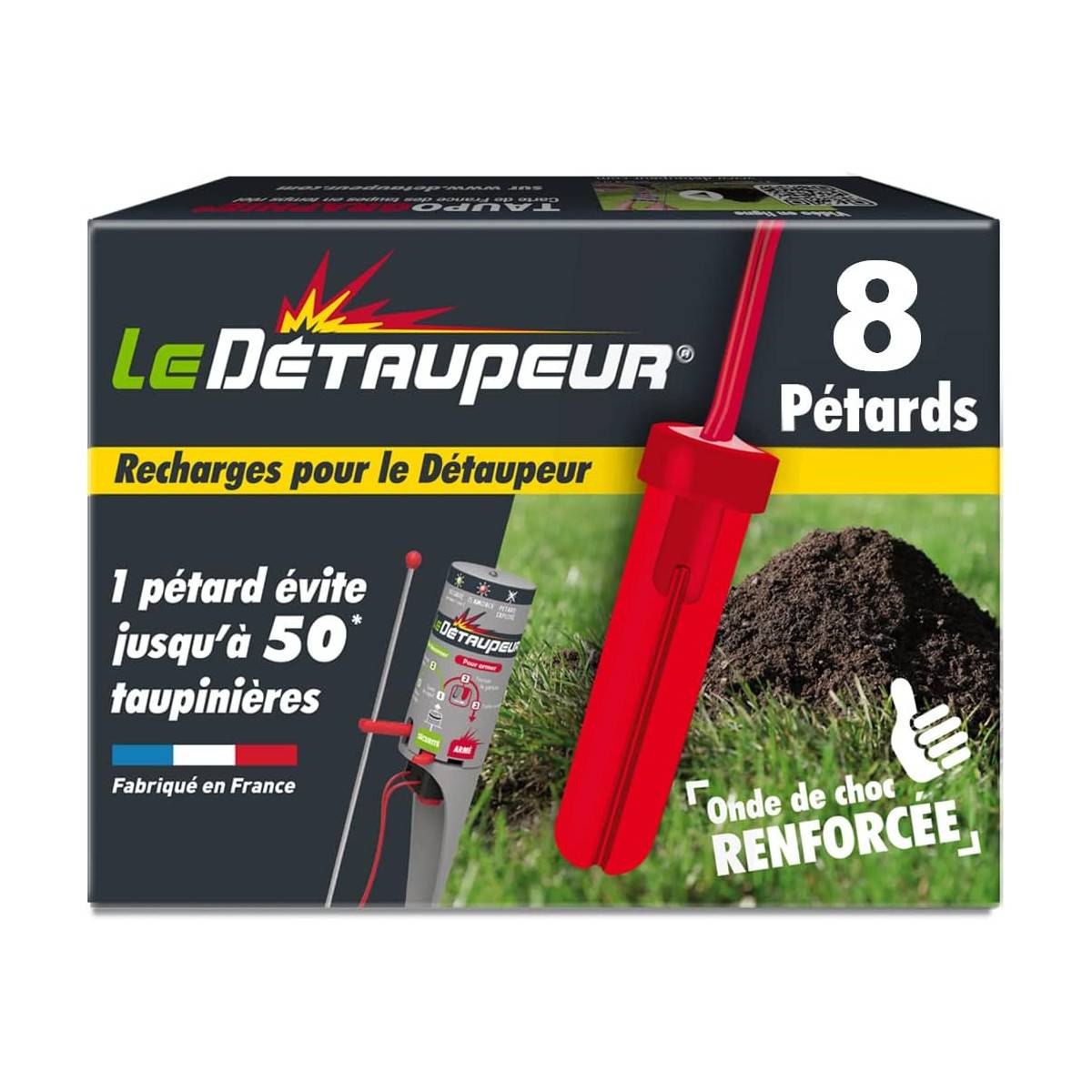 Les recharges X8 pour le Détaupeur sont idéales pour lutter contre les taupes et rats taupiers de façon efficace et sécurisée. Utilisables sous la pluie, ces recharges sont calibrées pour une puissance optimale, éliminant jusqu'à 50 taupinières avec un seul pétard. Leur système exclusif RECHARG8 permet un armement sécurisé, assurant la tranquillité de votre jardin tout au long de l'année. La valisette DETAUPEUR est nécessaire pour pouvoir utiliser ces pétards.