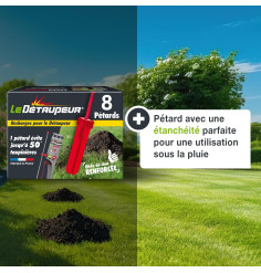Les taupes et les rats taupiers transforment votre pelouse en champ de bataille ? Pas de panique, les recharges X8 pour le Détaupeur sont l'arme secrète pour lutter contre ces intrus. Conçues pour être utilisées avec le système anti-taupes Détaupeur, ces recharges apportent une solution rapide et efficace pour protéger votre jardin. Utilisables même sous la pluie, elles sont prêtes à relever tous les défis éliminant jusqu'’à 50 taupinières avec un seul pétard.