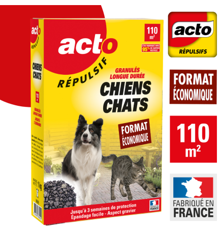 Spécialement conçu pour les grandes surfaces, le répulsif en granulés ACTO Répulsif Granulés Chien Chat 1 kg RECH 5 en format économique de 1 kg est la solution parfaite pour protéger durablement votre propriété. Capable de couvrir jusqu'à 110 m², il est idéal pour traiter le pourtour d'une maison, de longues allées ou de vastes jardins.