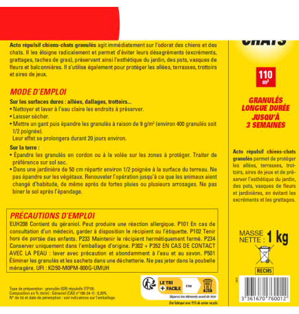 Le répulsif en granulés ACTO pour chiens et chats a été formulé pour répondre à ce besoin. Son efficacité repose sur une action purement olfactive : il dégage une odeur qui incommode fortement les chiens et les chats, les incitant à passer leur chemin. Le principe actif, le Géraniol (CAS n° 106-24-1), dosé à 0,20 %, est spécifiquement utilisé pour créer cette barrière odorante. Il ne s'agit pas d'un poison, mais d'un outil de dissuasion puissant qui agit sur le comportement des animaux pour modifier leurs habitudes et les encourager à trouver un autre territoire, loin de chez vous.