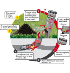 Leggi attentamente e integralmente le istruzioni. Non maneggiare mai un petardo vicino a una fonte di elettricità (batterie, ecc.) Non usare né armare l'apparecchio in uno spazio chiuso e coperto. Tenete i bambini lontani dal perimetro dell'installazione e, se possibile, segnate il perimetro. Dopo l'uso, conserva l'attrezzatura fuori dalla portata dei bambini, nella valigia fornita a questo scopo. In caso di malfunzionamento, restituire il dispositivo senza petardi o batterie. LA TRAPPOLA PER TALPE è una trappola per talpe che sfrutta un comportamento caratteristico della talpa: riempie sistematicamente un foro lasciato aperto. Avviso di sicurezza: il livello di clorato di potassio e perclorato di potassio è inferiore al 40%. Infatti, il tasso è compreso tra il 20% e il 25%