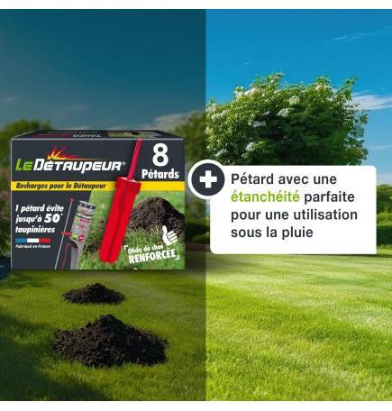 Chi dice che la pioggia dovrebbe fermare la lotta contro le talpe? Le ricariche del Détaupeur sono perfettamente impermeabili, il che permette di usarle in tutte le condizioni meteorologiche. Questo è un vero vantaggio per chi vuole mantenere il proprio giardino impeccabile in tutte le stagioni, senza doversi preoccupare dell'umidità.